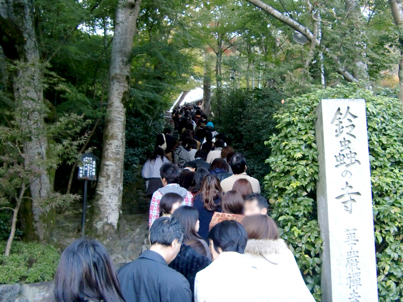 秋だけでなく、四季を通じて鈴虫の音色を聞くことのできる境内。それゆえ「鈴虫寺」の名で親しまれている。正式名称は「妙徳山 華厳寺(みょうとくざん けごんじ)」。縁結びのお守りを求め毎日行列ができる。